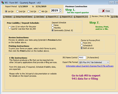 If you are e-filing, use the following steps to preview the 941 forms and verify the data, and optionally print the forms for reference as a file copy.